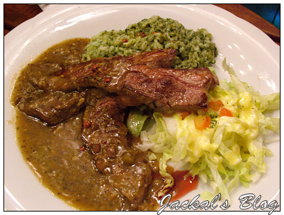 綠色的是蘿勒醬飯,而無骨牛小排的部份,約八九分熟,吃起來很有嚼勁